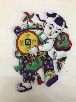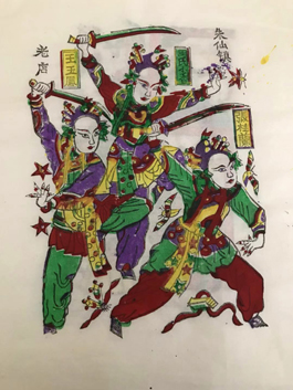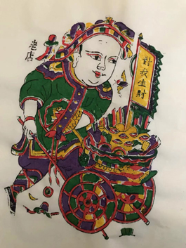 勾描以简练的笔墨表现画面图案,塑造人物形象,讲究笔锋的顿、挫、转、折。木刻选材为当地盛产的梨木,软硬适中、纹理细腻、下刀顺畅,运刀自如。一张手工精制雕版,既是对绘画原稿的二度创作,又让年画成品在灵动之外多了几分古朴硬朗。木板水印时,先印线,再层层套色。每套一色要换一版。调色一样有讲究,神像色彩厚实,显得画面庄重,娃娃仕女则色彩清淡、底色清新自然。彩绘继承了工笔重彩的绘画风格,是杨柳青年画独一无二的制作工艺。利用笔触色调,控制水色晕染,将套印后的版韵与手绘技法巧妙融合,相得益彰。“勾、刻、印、绘”四大工序每一步都需要数十年的修炼方可精通,每一幅年画既是集体的作品,也是时间的艺术。
