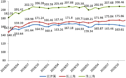 2020年全年,受北京及环京房价下跌、流动人口疏解和疫情防控力度大等因素影响,京津冀租赁指数自5月份连续8个月同比下跌,12月末同比下降0.56%;长三角城市群中上海、宁波等核心城市房价反弹,人口持续流入,加上复工复产较快等因素的影响,租赁指数2020年各月均同比上涨,全年上涨2.79%;珠三角住房租赁市场整体平稳上升,租赁指数自8月份同比连续上涨,但涨幅不断收窄,全年上涨0.18%,弱于长三角。
