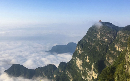 空中缆车直达峨眉山的第二高峰——金顶。此处是游览的重点,也是终点。走出缆车,登上金顶,只觉天地豁然开阔,浑身上下如同炎夏浇了冷水一般清爽。举目四望,云涛起伏,浩浩荡荡,横无际涯,天风浩荡,云海蒸腾。有时,乱云从脚下急驰而过,你恍如腾云驾雾;有时,云层如白纱遮面,突然掀起一角,露出青翠的山峦。万般物像虚无缥缈,如梦如幻。