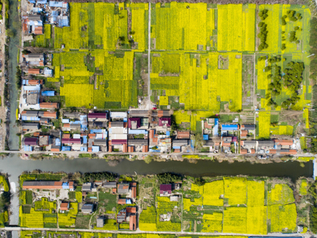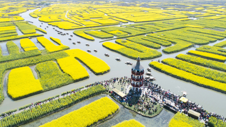 春日里的江苏兴化,油菜花开如画,万亩“垛田”染出春天最美的那抹金黄。“垛田”是江苏兴化最具特色的农田,呈现出一幅“河有万湾多碧水,田无一垛不黄花”的绮丽画卷;行走在江苏海安的乡间田野,你就会不时看到红色的抽油机、金色的菜花、蔚蓝的天空相映成景;走过铁道边,不一会儿就有“开往春天的列车”穿越油菜花海飞驰而过;水乡的农村住宅,则多沿着河道傍水而建,空中俯瞰,多彩的民宅、蜿蜒的道路、曲折的水道、金色的田地构成了一幅幅壮美的图景。