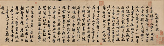 毋庸置疑,苏轼是“唐宋八大家”中的明星,他穿越一千年的魅力,令今人为之钦慕。本展中最引人注目的展品是苏轼书写于59岁的《洞庭春色赋 中山松醪赋》。全卷由7张白麻纸接装而成长卷,达3米,共684个字,这是现存字数最多的苏轼书法作品,借自吉林博物馆。“洞庭春色”是心黄柑酿就的酒,为安定郡王赵令畤所督造。他派自己的侄子送到苏轼手中,苏轼为表达感谢,当即作赋一篇。此后,由于不满京城中新党与旧党之间无休无止的争论,苏轼自请外派到定州任知州。他自己酿了一种酒,名“中山松醪酒”。松醪是通过烹煮松节取出枝中脂,跟黍米、麦子一起煮熟,然后以此为原料酿酒。味道甘甜,余味略苦。这篇赋是他记录酿制的经过,从中有所感悟的内容。1094年,苏轼被贬岭南时因雨受阻于今天河南省的睢县,等待再次上路期间,濡墨挥毫将两篇赋文誊写了一遍。乾隆皇帝曾评:“精气盘郁豪楮间,首尾丽富,信东坡书中所不多见。”评价还是到位的。苏轼借酒抒怀,想象巧妙,沉雄劲健的书法,一气呵成。在展厅中,紧挨着这卷书法的是一封苏轼写给禅师朋友的书信,内容讲到他打算在阳羡(今宜兴)卖田的事宜,是他48岁时所书。在历史上,这件《卖田阳羡帖》与《洞庭中山》二赋都经历了重重磨难。最后一次险情发生在溥仪逃离位于长春的伪皇宫之时。守卫的士兵乘虚而入当时的伪图书馆,哄抢保存于其中的古代书画。由于各不相让,这两件作品的前部和后部被撕走,至今下落不明。所幸主体保存了下来,几经辗转,终于进入了国家的博物馆,得以妥善保管。