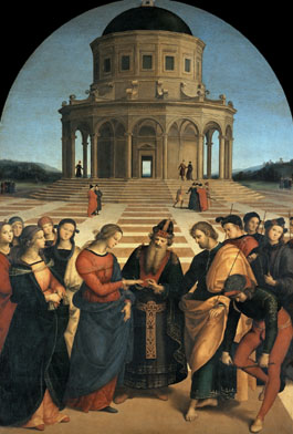 拉斐尔在艺术上是早熟的,这得益于父亲的培养,以及老师佩鲁基诺的亲传,14岁,他就模仿皮耶罗·德拉·佛朗切斯科画的乌尔比诺公爵夫人侧面像,在自家墙壁上创作了《母与子》湿壁画。1504年他借鉴老师佩鲁吉诺同主题作品创作的《圣母的婚礼》, 充分吸收了老师的艺术精华,且后来居上,无论是构图、人物造型还是色彩、透视都有所创新。尤其是画面平衡,背景的描绘,圣母玛利亚的庄严优雅均为前辈画家中所罕见。拉斐尔还不到十七岁就成为独立的艺术家。他早期的作品深受翁布里亚画派和北方弗莱芒画派的影响,追求细腻精密的现实主义表现,画风华丽、抒情,具有装饰性,人物往往柔和、纯净,有种静谧的幸福感。