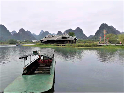第二天便是乘游轮游漓江。这儿的山水应该是桂林的精华了。站在游轮顶层,极目四望,远山如画,近水涵碧。正值烟雨迷蒙时节,云纱雾幔,江上烟波浩渺,群山若隐若现,浮云穿行于奇峰之间,展现在眼前的是一幅幅泼墨水彩画。“江作青罗带,山如碧玉簪”,漓江的山水,就像古代美女的头饰,如此蜿蜒多姿,如此风情万种。你可以闭上双眼深呼吸,感受一下新鲜的空气,那湿漉漉的清新是大自然独有的味道;你可以睁开双眼远眺,远处的山,或似白兔饮水,或似八仙游江,或似溯江鲤鱼,或似师徒取经,或似九马画山……总之,你尽可以发挥想象,让这些千姿百态的山峰栩栩如生起来。近观处更是一湾一景,船行过处,江水荡漾,凝翠吐绿,峰连着峰,崖接着崖,水上是静景,水下是动景,亦动亦静,美轮美奂。最美当属黄布滩了,两旁7座大小不一的山峰,婷婷玉立,恰似沐浴的少女,水中的倒影清晰可见,山依山,水环水,山水缠绵,顾盼生情,徜徉其中,如落仙景,恍若天上人间。