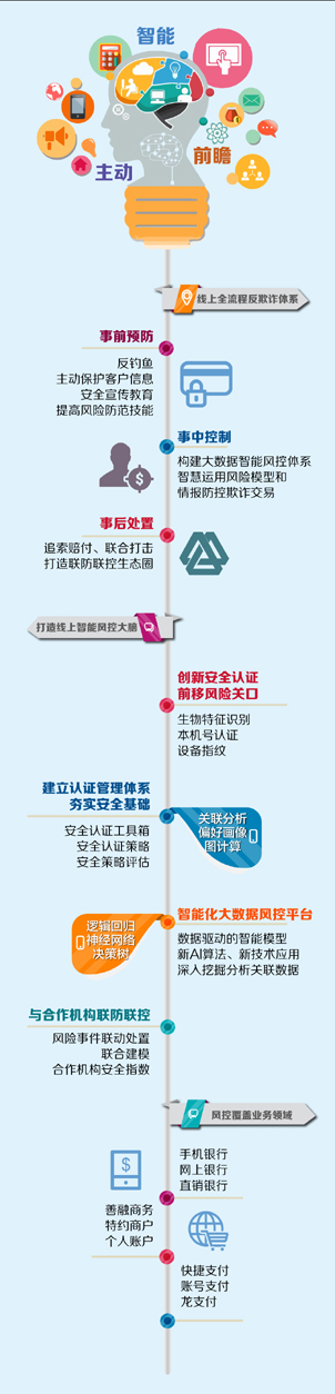 在客户眼里,从一笔网络渠道交易的发起,到风控专员联系自己核实,再到完成紧急处置,建行在短短几分钟之内对一个个骗局的“手起刀落”,经常引来客户这样发问:“你怎么知道我是退款被骗?”“你怎么知道我在网上刷单?” “什么?收款人是个骗子?你怎么知道?”其实建行之所以对各类欺诈行为见招拆招,对各种风险形式迅速反应,完全是依托于其背后强大的风险管控体系。客户看到的,仅仅是反欺诈工作成果的冰山一角。