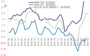 (一)海外经济:上半年,疫苗进展主导全球经济复苏预期,全球经济疫后复苏呈现强劲而不均衡的特点,供需错配、地区分化导致通胀快速攀升。虽然疫情反复令经济复苏慢于预期的风险已大大降低,但实现完全复苏仍有难度。基本面方面,美国复苏仍领先海外,消费需求从耐用品向非耐用品和服务业轮动,旺盛需求推动工业加速修复,救济金发放导致劳动力供给不足,通胀不断突破新高,5月PPI同比增长6.6%、PCE同比增长3.9%、核心PCE同比增长3.4%。欧元区偏强修复,工业生产强劲,核心通胀仍偏弱,6月HICP同比增长1.9%、核心HICP同比增长0.9%。日本经济未见明显改善,国内生产和消费疲弱,外需带动出口增速创上世纪80年代以来最快,通胀低迷,5月CPI同比萎缩0.1%、核心CPI同比增长0.1%。货币政策方面,美联储6月会议有所转鹰,加息预期前移,货币政策进入过渡期;欧央行仍以鸽派为主;日央行维持宽松取向,并延长企业融资优惠政策期。(图1)