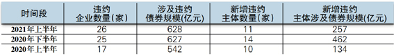 今年上半年信用债违约总体情况与去年下半年基本持平,新增违约情况改善。上半年累计有26家企业违约,涉券规模约628亿元,分别较去年下半年增加1家、1亿元。新增违约企业11家,违约涉券规模257亿元,分别较去年下半年减少3家、205亿元。具体而言,一季度信用债到期为年内高峰,整体违约规模较大。二季度在货币环境稳中偏松、地方债供给压力低于预期等因素影响下,违约情况明显改善。(表1)