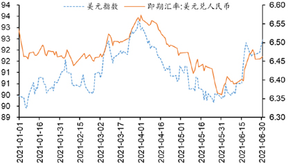 2021年上半年美元指数震荡收涨,主要走势跟随市场对美联储货币政策态度的变化而起伏。年初美元指数触及89.2193的三年低位;一季度,因美国经济复苏预期强劲,市场对美国通胀前景担忧增加,美元指数筑底反弹;二季度,美联储持续向市场传递“鸽派”立场,同时欧元区经济复苏重启,欧元阶段性走强令美元指数承压下挫;6月中旬美联储超预期偏鹰,美元指数重拾涨势。上半年美元指数波动区间为【89.2193,93.4417】,截至6月末,较去年年末收涨2.68%至92.3671。