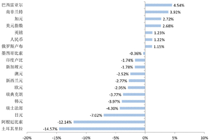 上半年,在美元整体相对强势的情况下,非美货币普遍承压下行,部分主要经济体和新兴市场国家选择了缩减购债或收紧货币政策。美指篮子货币中,欧元因欧洲复苏进程整体落后于美国而小幅走弱,日元因日本国内疫情反复持续疲软,英镑受益于英国疫情防控“优等生”,加元因加拿大央行鹰派作风而强劲。商品货币中,虽大宗商品价格强劲,但澳元、新西兰元因新冠肺炎疫情反复而未能相应提升。新兴市场货币中,土耳其里拉、阿根廷比索表现疲软,成为全球表现最差的两个货币;而俄罗斯、巴西、墨西哥等国先后宣布加息,带动其本币强势,其中巴西雷亚尔对美元上涨4.54%,成为全球表现最佳货币。(图2)