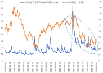第三,市场情绪转好,令美元避险需求减弱。2020年新冠肺炎疫情以来,美元流动性需求与市场情绪紧密连续,美元避险货币属性得以增强,VIX指数与美元指数走势近乎趋同。预计未来12个月美元流动性依然充裕,美元的避险需求会逐渐减弱。不过当前风险因素较多,市场情绪反转可能随时出现。(图3)