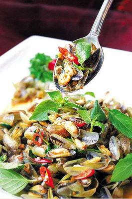 而对于薄壳的烹饪,潮汕人都有着一种近乎相似的做法。此时去市场买上几斤薄壳,老板定会主动送上一把金不换,似乎认定你会拿着这两样东西一起炒。金不换的学名是九层塔的罗勒,这东西与薄壳称得上是潮菜中最当仁不让的搭配。金不换炒薄壳的过程也很简单,金不换和蒜泥辣椒丝先行下锅,厚油,旺火,与薄壳一块翻炒几下,氤氲的芳香不断挥发,赋予薄壳浓香的同时,避免盖住其本身的鲜味。两三分钟后,薄壳张口,此时出锅最为鲜嫩爽口。这时的薄壳在金不换的点缀下早已去腥,提味,其中菜肴汁水鲜美程度的特性发挥到了淋漓尽致,更是有着近乎瑶柱般的口感。