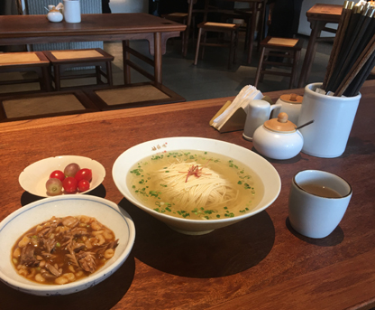 六月的苏州进入了梅雨季节,湿嗒嗒的天气让人颇为烦躁。走进复古典雅的面馆,点上一碗面,汤汁清澈,细白的面条卧在青花大碗中,犹如“鲫鱼之背”,绿葱点点,白糟粒粒,面上是一块白嫩透明的焖肉,使人顿觉清新。趁热吃完,酣畅淋漓的汗,洗净了那层湿,放松了一天的疲劳,食客回味着美食,望着窗外雨后的天空,自是另一番风味。