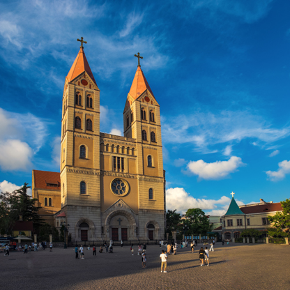 青岛因为有德国、日本很长时间的殖民地历史,近代老建筑不少,有着“万国建筑博览会”的称号,只是时间不允许我多看几个。我特地去看了圣弥厄尔大教堂,国家重点文物保护单位,异国风情的哥特式尖顶在夕阳下散发着温暖的光芒。