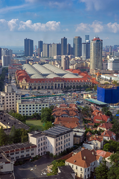 青岛的晨昏、夜色都是美的,在房间里看,或者在海边看,海滨多变的光影给城市呈现出不同的美感。即便是中午,青岛火车站的建筑和前面一片红顶的房子也会相映成趣,形成青岛特别的“绿树红瓦”景象。青岛一中附近的运动场在黄昏的暖光下空荡着,大概是暑假的缘故,看不到学生的喧闹。
