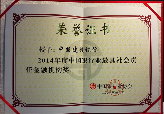 6月26日,中国银行业协会在京举办《2014年度中国银行业社会责任报告》发布暨社会责任工作表彰会,中国建设银行获得“年度最具社会责任金融机构奖”、“年度社会责任最佳民生金融奖”两个综合大奖。